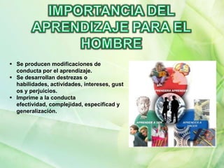Este documento resume diferentes conceptos relacionados con el aprendizaje. Define el aprendizaje como un proceso mediante el cual se origina o modifica una conducta en respuesta a una situación. Explica que existen dos tipos de aprendizaje: aprender conductas y aprender motivaciones conductuales. También describe aspectos cognitivos, psicomotores y afectivos del aprendizaje, así como los procesos de condicionamiento clásico y operante.