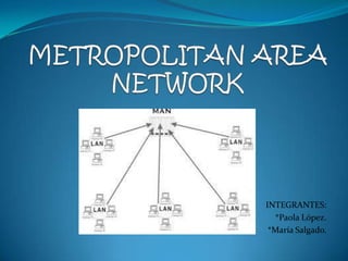 El documento describe una red de área metropolitana (MAN), la cual ofrece una conexión de banda ancha a alta velocidad en un área geográfica extensa, integrando múltiples servicios como datos, voz y video a través de tecnologías como ATM, Frame Relay, xDSL, WDM, ISDN, E1/T1 y PPP sobre medios de comunicación como cobre, fibra óptica y microondas.