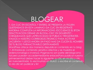 El documento proporciona instrucciones para crear y administrar un blog en WordPress. Explica cómo publicar entradas y páginas, añadir categorías e imágenes, seleccionar temas, e insertar widgets. También describe cómo configurar las opciones generales del blog como el título, descripción y idioma.