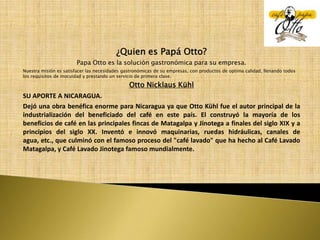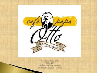 Papa Otto es una cafetería que ofrece servicios gastronómicos a empresas, incluyendo buffets contratados previamente con diferentes opciones de comida, venta directa de golosinas y panadería, y catering para eventos. La cafetería cuenta con equipos y personal calificados para satisfacer las necesidades alimenticias de sus clientes de manera higiénica y de calidad.