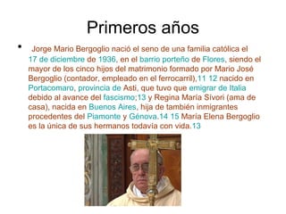 El documento presenta una biografía resumida del Papa Francisco. Nació en Argentina en 1936 y fue elegido Papa en 2013, convirtiéndose en el primer Papa latinoamericano. Antes fue arzobispo de Buenos Aires y se ha destacado por su humildad y énfasis en los pobres. El documento también resume algunas de sus acciones y enseñanzas como el diálogo interreligioso y la lucha contra el abuso sexual.