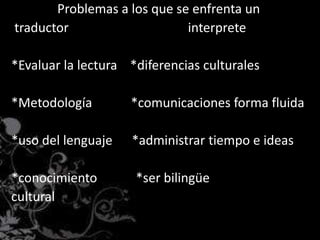 El documento describe los roles y responsabilidades de un intérprete. Explica que un intérprete debe ser bilingüe, dominar ambos idiomas, y ser neutral con los clientes. También discute los desafíos que enfrentan como evaluar culturalmente, administrar el tiempo, y la fatiga causada por sesiones largas.