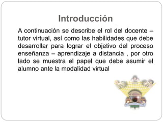 El documento describe el papel del docente tutor virtual, quien diseña materiales educativos, facilita el aprendizaje adaptándose al ritmo de cada estudiante, y evalúa los progresos. Un buen docente virtual tiene sólida formación, habilidades tecnológicas y sociales, y motiva la investigación. También describe las características que debe tener un estudiante virtual como ser auto-motivado, responsable, comunicativo y con habilidades tecnológicas.