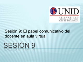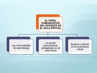 El documento describe el papel comunicativo del docente en el aula virtual. Explica que el docente organiza y orienta el aprendizaje, promueve redes sociales y tecnológicas, y se transforma en un administrador de recursos educativos y guía para los estudiantes. También requiere competencias tecnológicas y comunicativas para crear espacios de aprendizaje dialogante en un entorno virtual.