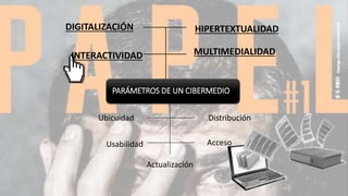 Este documento define los parámetros clave de un cibermedio digital como la digitalización, hipertextualidad, multimedialidad, actualización, distribución, acceso e interactividad. Explica que la interactividad permite al usuario interactuar con la información y describe cuatro tipos. También describe la multimedialidad como la combinación de formatos en una información y su adaptación a plataformas múltiples. Finalmente, analiza conceptos como la hipertextualidad, interacción entre usuarios y máquinas, y la relación entre interactividad y multimed