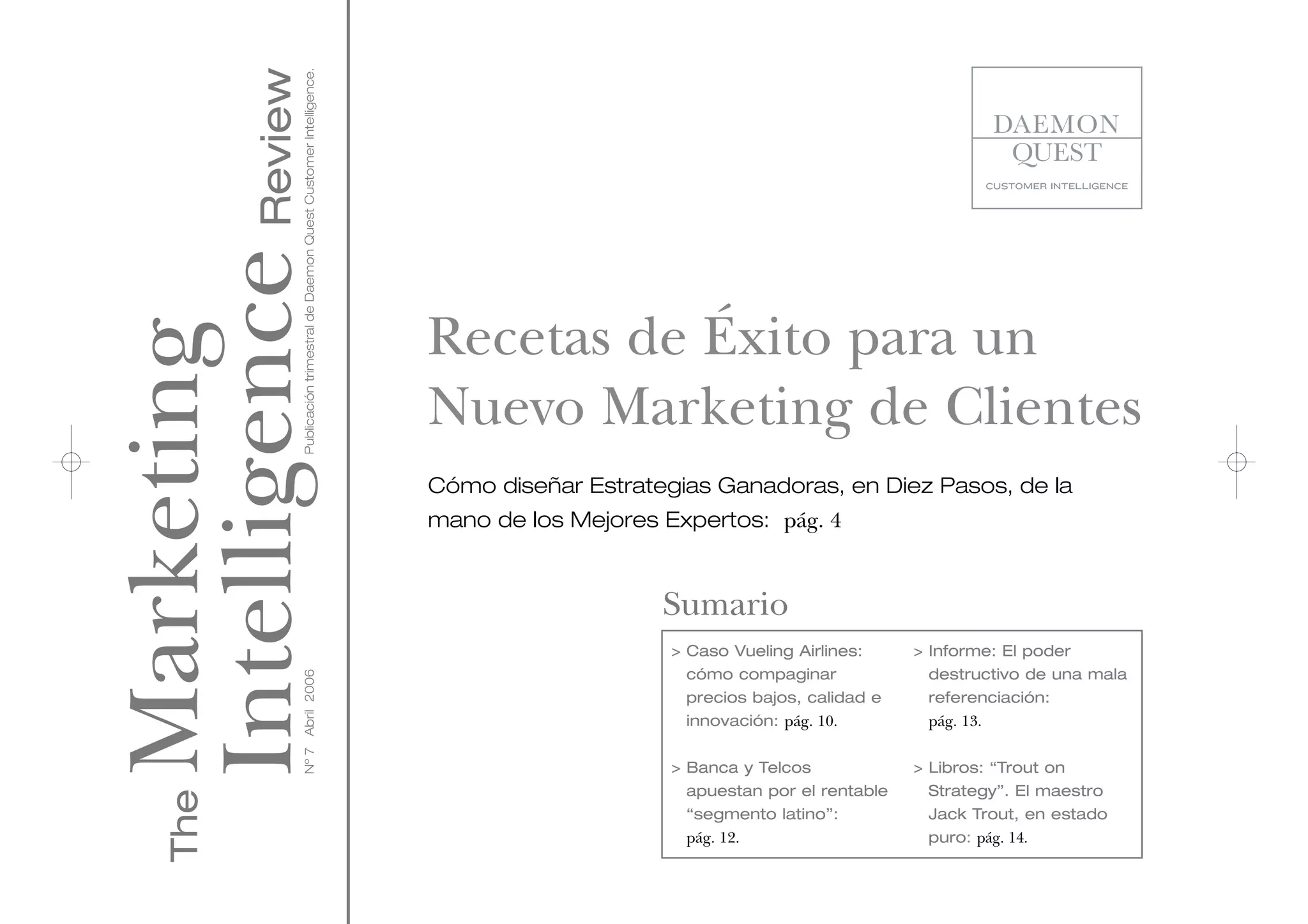 El documento presenta un resumen de las "Recetas de Éxito para un Nuevo Marketing de Clientes" en 10 pasos clave, entre los que se incluyen: 1) Pasar de un marketing táctico a uno estratégico; 2) Acertar con la fórmula de posicionamiento, segmentación y targeting; 3