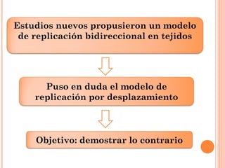 Este documento presenta un estudio que reexamina el modelo de replicación mitocondrial en mamíferos mediante el uso de microscopía de fuerza atómica y electroforesis bidimensional. Los autores encontraron evidencia de orígenes alternativos de la cadena liviana del ADN mitocondrial, lo que contradice modelos previos que proponían una replicación asimétrica. Esto sugiere que la replicación ocurre por desplazamiento de hebras con orígenes alternativos de la cadena liviana, en lugar de un mecanismo acoplado de