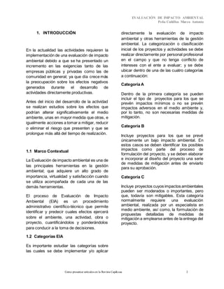 El documento describe el proceso de Evaluación de Impacto Ambiental (EIA), que permite identificar y predecir los efectos de un proyecto sobre el ambiente. El objetivo de la EIA es evaluar los impactos de un proyecto sobre el medio ambiente para prevenir, controlar, mitigar y compensar dichos impactos. La EIA sigue un procedimiento que incluye definir el proyecto, caracterizar el área, identificar posibles impactos, y definir medidas de mitigación.