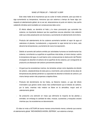 Los tres documentos hablan sobre la importancia de la sostenibilidad ambiental y la necesidad de acción urgente sobre el cambio climático. El primero describe las graves consecuencias del calentamiento global si no se reduce pronto las emisiones de carbono. El segundo documento trata sobre la "agenda verde" y la importancia de diseñar edificios que sean ecológicos. El tercer documento habla sobre un enfoque de "cuna a cuna" para el diseño de productos y materiales, con énfasis en ciclos cerrados de reutilización para ev