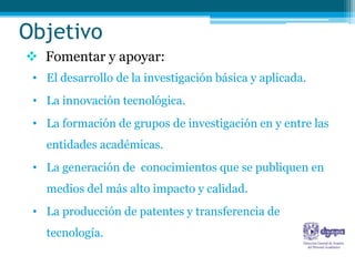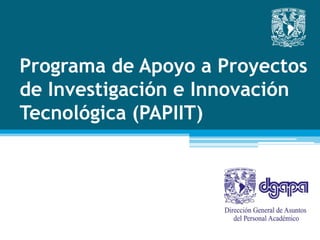 Este documento describe el Programa de Apoyo a Proyectos de Investigación e Innovación Tecnológica (PAPIIT) de la UNAM. El objetivo del programa es fomentar la investigación básica, aplicada e innovación tecnológica a través de proyectos de 1 a 3 años. Los proyectos son evaluados por comités disciplinarios y se otorgan fondos de hasta $200,000 por proyecto. La Facultad de Filosofía y Letras ha tenido entre 91 y 14 proyectos entre 2007-2012 con un total de 19 a