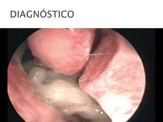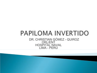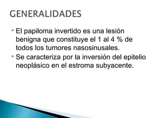 El documento describe el papiloma invertido, un tumor benigno del 1-4% de los tumores nasosinusales. Se caracteriza por epitelio neoplásico invaginado en el estroma subyacente. Tiene etiología viral, asociado con VPH tipos 6, 11 y 16. Se origina en las fosas nasales e invade senos adyacentes. Presenta frecuentes recidivas debido a multifocalidad. Su tratamiento es quirúrgico agresivo para remover la lesión con márgenes amplios.