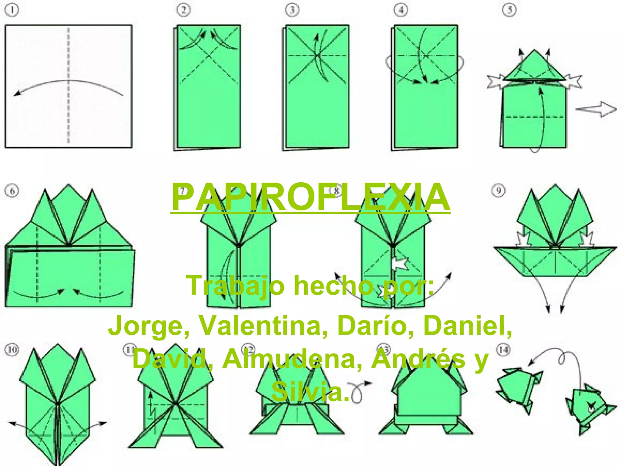 La papiroflexia es el arte de hacer esculturas plegando solo papel sin cortarlo. Se originó en el siglo XIX cuando se combinaron artes orientales y occidentales. Requiere paciencia y entrena el cerebro al requerir muchos pliegues y recordar pasos. Permite crear figuras de animales u objetos solo usando papel doblado siguiendo reglas y pasos.