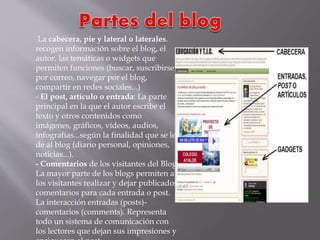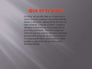 Un blog es un sitio web donde uno o más autores publican artículos de forma cronológica. Los blogs permiten a los autores publicar sus propias ideas y opiniones sobre diversos temas, y también permiten que los lectores interactúen y comenten los artículos publicados. Los blogs tienen diferentes componentes como la cabecera, el pie de página y las entradas principales donde se publica el contenido, y vienen en varios formatos como blogs de texto, fotos, video, audio, entre otros.