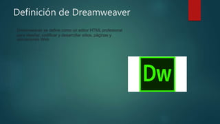 Dreamweaver es una aplicación creada originalmente por Macromedia y ahora propiedad de Adobe Systems, que se utiliza para diseñar y editar sitios y aplicaciones web basadas en estándares. Dreamweaver se define como un editor HTML profesional para crear y desarrollar páginas y sitios web. HTML es el lenguaje fundamental para establecer la estructura y contenido de los sitios web.