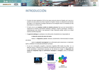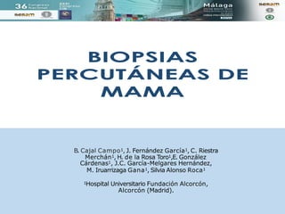 Este documento describe los procedimientos de biopsia mamaria guiada por imagen, incluyendo biopsia con aguja gruesa, punción aspiración con aguja fina y biopsia asistida por vacío guiadas por ecografía, estereotaxia o resonancia magnética. Explica los beneficios de estas técnicas como alternativas precisas y menos invasivas a la biopsia quirúrgica para el diagnóstico del cáncer de mama, con tasas de correlación superiores al 95%.