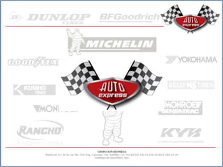 Grupo Autoexpress es una empresa mexicana dedicada a la venta de llantas, refacciones y servicios automotrices para vehículos particulares y de empresa. Ofrece productos y servicios de alta calidad a través de un equipo técnico especializado. Fundada en 2004, ha crecido a tres sucursales que brindan servicios como alineación, balanceo, frenos, suspensión y más. También ofrece programas de mantenimiento para flotillas con beneficios como diagnósticos gratuitos y servicio a domicilio.
