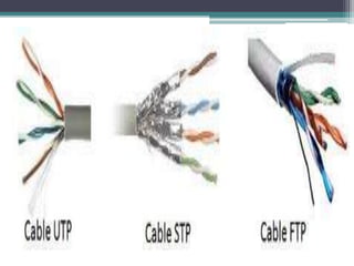 Este documento describe tres tipos principales de cables de par trenzado: UTP (sin blindaje), STP (con blindaje individual por par) y FTP (con blindaje global). Un cable de par trenzado consiste en dos alambres de cobre aislados que se trenzan para transmitir datos. El STP ofrece la mayor inmunidad al ruido pero también es el más caro, mientras que el UTP es el más económico pero más propenso a errores.