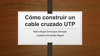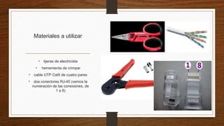 El documento describe los pasos para construir un cable cruzado UTP. Primero se pelan los aislamientos externos para exponer los cuatro pares de cables trenzados. Luego se colocan los cables en el conector RJ-45 de acuerdo a un orden específico. Finalmente, se aprieta el conector en la herramienta de crimpado para fijarlo al cable. El proceso se repite en el otro extremo y se prueban las conexiones con un tester.
