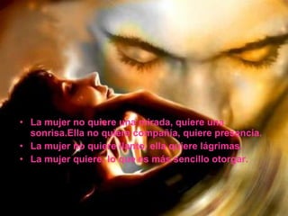 El documento ofrece consejos para comprender mejor a la mujer. Explica que las mujeres buscan sentimientos como la presencia, el tacto y el romance, en lugar de solo compañía, momentos o sexo. También destaca que las mujeres esperan ser admiradas y amadas, no poseídas, y que son misteriosas más que difíciles. En resumen, para comprender a la mujer, se debe apreciar su lado sentimental en lugar de tratarla como a un hombre o un objeto.