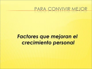 Este documento discute varios factores que mejoran el crecimiento personal, como buscar la coherencia entre los pensamientos, sentimientos y acciones de una persona, trabajar en las propias vocaciones y pasiones, y cultivar relaciones de amor y autoestima. También habla de los beneficios de una mente flexible frente a una mente rígida, y la importancia de vivir en el presente y aceptar las diferencias de otros.