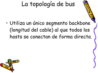 Este documento describe diferentes tipologías físicas y lógicas de redes. Las topologías físicas incluyen bus, anillo, estrella, estrella extendida y jerárquica. La topología en malla se usa cuando no puede haber interrupciones. Las topologías lógicas son broadcast, donde cada estación envía datos a todas las demás, y token, que controla el acceso mediante la transmisión secuencial de un token electrónico.