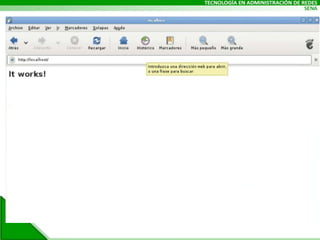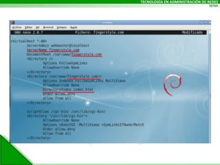 Este documento proporciona 8 pasos para instalar un servidor web Apache en Debian 5: 1) instalar el paquete Apache2, 2) editar archivos en el directorio sites-available, 3) copiar y modificar el archivo default, 4) enlazar directorios, 5) verificar el enlace, 6) editar el archivo Hosts, 7) reiniciar el servicio Apache, 8) editar el archivo index.html para cambiar el contenido de la página.