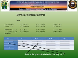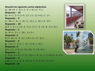 Este documento presenta una serie de ejercicios de números enteros que incluyen sumas, restas, multiplicaciones, divisiones, expresiones algebraicas y aplicación de la propiedad distributiva. El documento contiene más de 30 ejercicios numéricos para resolver.