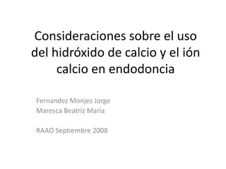 Este documento discute el uso de varios agentes químicos en endodoncia, incluyendo hidróxido de calcio, yodo, ácido cítrico y clorhexidina. Explica que el hidróxido de calcio se ioniza completamente y es soluble en ácidos. Su acción biológica se debe a la disociación iónica. El yodo tiene propiedades antibacterianas potentes. El ácido cítrico elimina la capa residual en la dentina. La clorhexidina tiene un amplio espectro antibacteriano y b