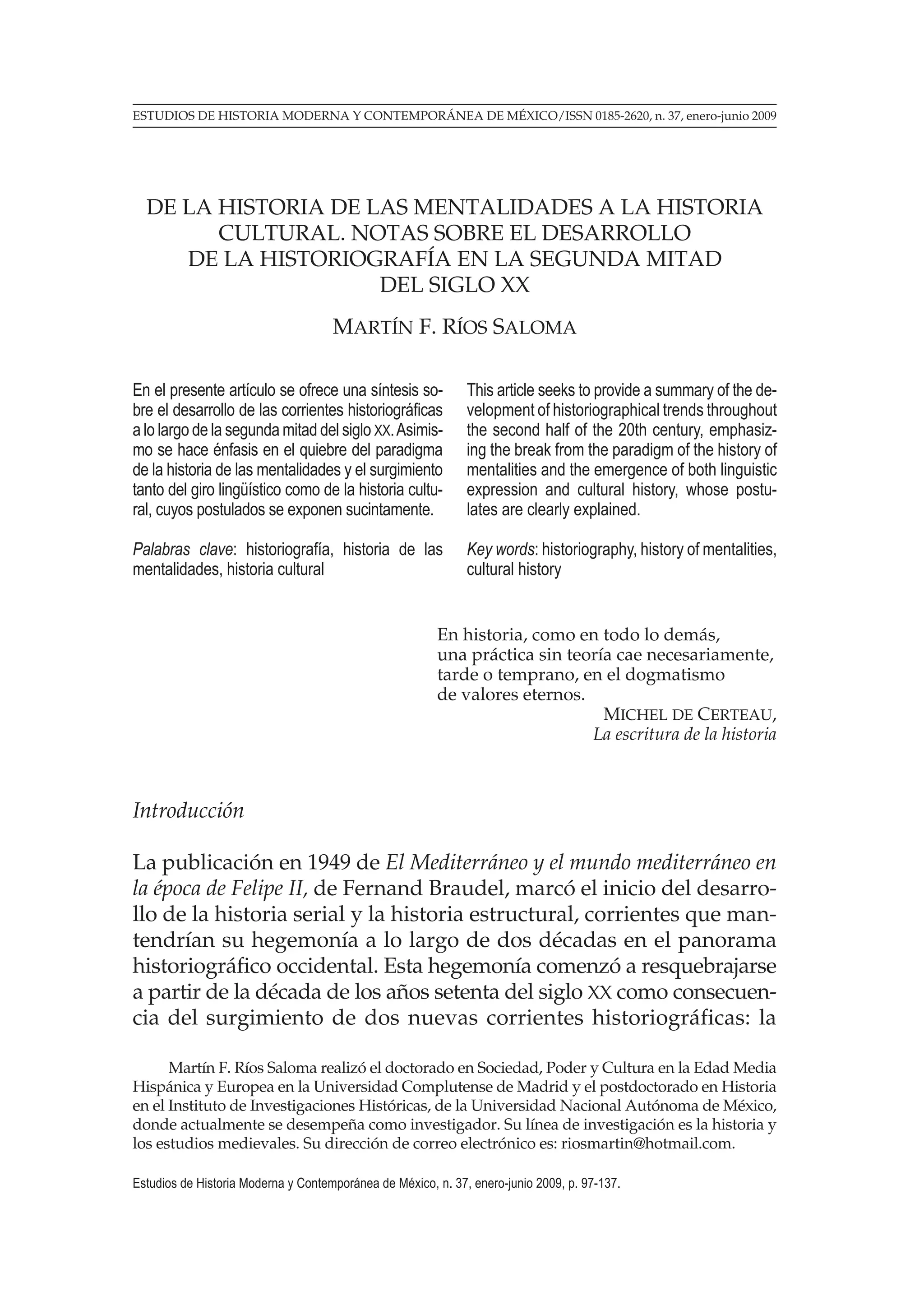 Este documento resume el desarrollo de las corrientes historiográficas en la segunda mitad del siglo XX, destacando el surgimiento de la historia de las mentalidades y la historia cultural. La historia de las mentalidades, impulsada por Georges Duby en 1961, buscaba estudiar las respuestas de las sociedades a interrogantes sobre el universo y el destino humano. Más adelante, la crítica a esta corriente dio paso al desarrollo de la historia cultural, que integró elementos de la sociología y el giro lingüíst