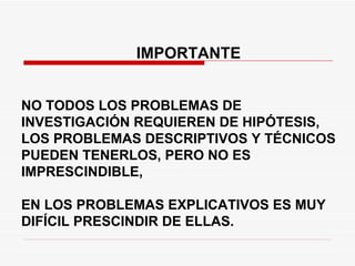 El documento explica qué son las hipótesis, sus características y tipos. Una hipótesis es una proposición tentativa que intenta explicar un problema u objeto de investigación de manera provisional. Debe ser clara, precisa y comprobable. Existen hipótesis descriptivas, correlacionales y causales, y también hipótesis nulas y alternativas para verificarlas. Una hipótesis bien formulada identifica las unidades de análisis y las variables clave.