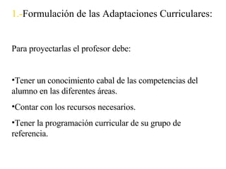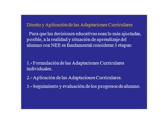 El documento describe diferentes adaptaciones curriculares que un profesor puede implementar para estudiantes con necesidades educativas especiales. Primero, el profesor debe evaluar las habilidades del estudiante y contar con recursos y la programación curricular del grupo. Las adaptaciones deben enfocarse primero en la evaluación y las metodologías antes que en los contenidos. Luego, el profesor debe aplicar las adaptaciones colaborando con otros y monitorear el progreso del estudiante para ajustar las adaptaciones. Algunas adaptaciones incluyen cambios a las