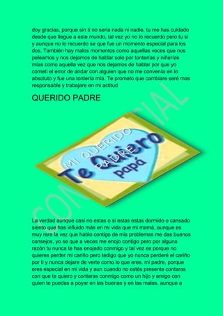 El autor le escribe cartas a su madre y padre expresando su aprecio y gratitud por todo lo que han hecho por él. Agradece a su madre por sus esfuerzos incansables para sacarlos adelante casi en solitario, y por enseñarle valores como el amor y el respeto. También pide disculpas por no valorar siempre sus sacrificios. Le expresa a su padre que, a pesar de no convivir mucho, lo considera una influencia positiva y una figura a seguir; no obstante, le pide que deje sus adicciones para poder