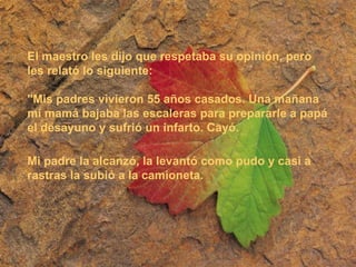 El maestro les contó a los jóvenes la historia de sus padres que estuvieron casados por 55 años. Cuando la madre murió repentinamente, el padre la llevó rápidamente al hospital y luego la llevó al cementerio donde expresó el gran amor y apoyo que se tenían durante todos esos años compartidos. El maestro concluyó que este tipo de amor verdadero se basa en el trabajo y cuidado mutuo de dos personas comprometidas, no solo en el romanticismo.