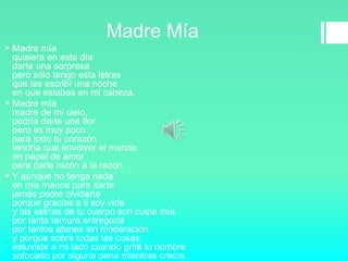 Este poema es una carta de amor de una hija para su madre. Expresa el deseo de sorprender a su madre pero solo tiene palabras escritas en una noche pensando en ella. Aunque no tiene un regalo para dar, nunca podrá olvidar a su madre porque gracias a ella es vida. Recuerda con cariño la ternura y afecto incondicional de su madre durante su crecimiento.