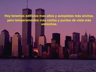 El documento analiza cómo la sociedad moderna tiene más bienes materiales pero menos bienestar emocional y espiritual. A pesar de tener casas y salarios más grandes, las familias son más pequeñas y hay más divorcios. Se insta a las personas a valorar cada momento de la vida, a expresar el amor a los seres queridos y a vivir plenamente en lugar de aplazar la felicidad para el futuro.