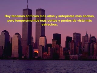 El documento contrasta cómo en la sociedad moderna tenemos más bienes materiales pero menos bienes intangibles como tiempo, salud, valores y conexiones interpersonales. A pesar de los avances tecnológicos, las personas tienen temperamentos más cortos, puntos de vista más estrechos y hablan menos del amor. El documento concluye instando a las personas a valorar cada día y momento especial que viven.