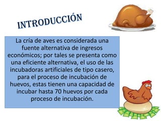 El documento describe el proceso de incubación de huevos que lleva al desarrollo del embrión de pollo hasta su nacimiento, incluyendo las etapas del huevo sin fecundar, el huevo fecundado de 4 días, el huevo de 9 días, el huevo de 14 días, y el pollo al nacimiento 1 día después de la eclosión a los 21 días. Explica los parámetros clave de la incubación como la temperatura, humedad, ventilación y volteo de huevos requeridos para apoyar el desarrollo saludable