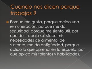 El documento discute las razones por las cuales las personas trabajan. A lo largo de la historia, el trabajo se ha conceptualizado como una carga necesaria más que algo que se hace por gusto. Sin embargo, el trabajo satisface necesidades básicas como alimento y sustento, permite aplicar habilidades y conocimientos, y dignifica la vida de las personas. El amor por el trabajo es un reflejo del amor propio.