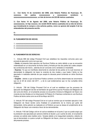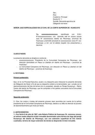 Este documento presenta una demanda ejecutiva de obligación de hacer contra la presidenta y la Comunidad Campesina de Pilcomayo. El demandante solicita que la comunidad cumpla con el desmembramiento de un lote de terreno que compró de sus padres, quienes eran comuneros. También solicita que los costos del proceso sean asumidos por la presidenta debido a su falta de atención al proceso de desmembramiento. El demandante proporciona antecedentes sobre la adquisición y venta sucesiva del lote de terreno, y