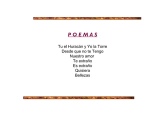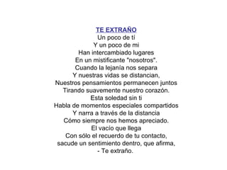 El documento contiene varios poemas cortos sobre temas como el amor, la añoranza, la belleza y la amistad. Los poemas expresan sentimientos de extrañar a un ser querido que está lejos, encontrar belleza en el amor de otra persona, y desear poder refugiarse en el corazón de alguien.