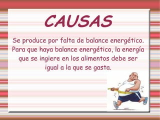 La obesidad se produce por un desequilibrio energético entre las calorías ingeridas y las quemadas, y puede ser causada por factores ambientales, genéticos, de salud y estilo de vida. Sus síntomas incluyen dificultad para respirar, problemas ortopédicos y sudoración excesiva. Su tratamiento implica modificar hábitos alimenticios, hacer ejercicio regularmente y en ocasiones recurrir a fármacos, con el objetivo de perder grasa de forma sostenida a largo plazo. La obesidad se