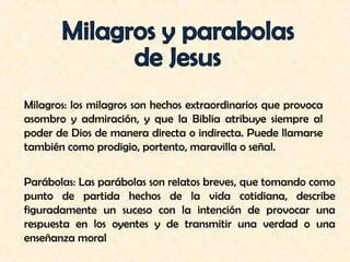 Este documento resume las parábolas de Lucas, incluyendo la parábola del hijo pródigo. Explica que las parábolas usan hechos cotidianos para transmitir enseñanzas morales o verdades espirituales de forma figurativa. Además, analiza la parábola del hijo pródigo, señalando que en realidad enfatiza la misericordia de Dios hacia los pecadores arrepentidos más que al hijo pródigo en sí mismo.
