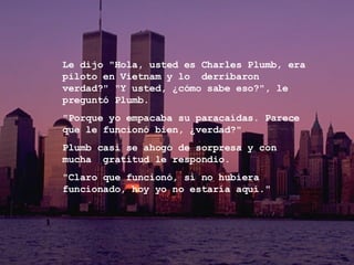 Charles Plumb, un piloto estadounidense derribado durante la guerra de Vietnam, se reunió años después con el marinero que empacó su paracaídas. Esta experiencia llevó a Plumb a dar conferencias recordando la importancia de reconocer a aquellos cuyo trabajo nos ayuda, como el marinero que empacó su paracaídas y le salvó la vida sin conocerlo. Plumb insta a la gente a preguntarse "¿quién empacó tu paracaídas hoy?" para agradecer a quienes nos apoyan a diario.