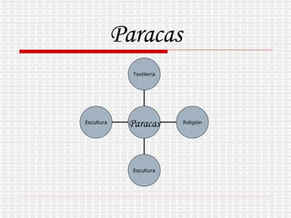 El documento aborda la cultura Paracas, enfocándose en su escultura, cerámica y textilería. También se menciona su contexto religioso y ubicación geográfica. Se destacan elementos específicos relacionados con la expresión artística y cultural de esta civilización.