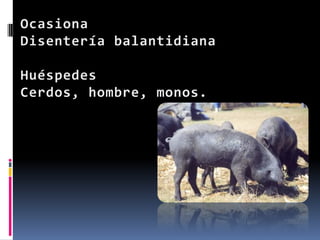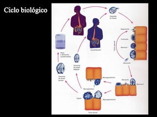 Este documento describe la morfología, ciclo de vida y reproducción de varios protozoos parásitos como Isospora, Trypanosoma, Entamoeba, Neospora, Giardia y Trichomonas. Los protozoos se reproducen de forma asexual mediante fisión binaria, fisión múltiple o gemación, y de forma sexual a través de conjugación o gametogonia. Algunos como los Apicomplexa se reproducen tanto sexual como asexualmente.