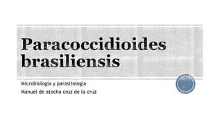 El documento describe la paracoccidioidomicosis, una micosis sistémica causada por el hongo dimórfico Paracoccidioides brasiliensis que se adquiere por inhalación y puede diseminarse a los pulmones, ganglios linfáticos y otras partes del cuerpo. La enfermedad es endémica en América Latina y se manifiesta principalmente en la forma de levadura en cultivos a 37°C. El diagnóstico se realiza mediante examen directo, cultivo e inmunodiagnóstico, y el tratamiento incl