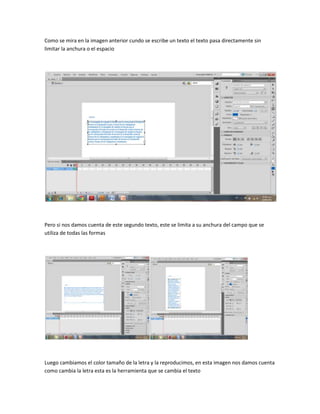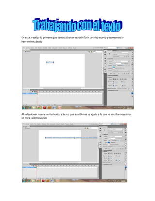 Este documento proporciona instrucciones sobre cómo usar las herramientas de texto en Adobe Flash. Explica cómo escribir texto que se ajusta automáticamente o se limita al ancho del campo, cómo cambiar el color, tamaño y alineación del texto, y cómo reproducir el texto para cambiar su apariencia. Finalmente, muestra cómo ejecutar el proyecto de Flash una vez completado.
