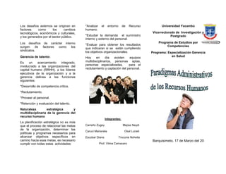 El documento habla sobre los paradigmas administrativos de los recursos humanos y los desafíos que enfrenta la gerencia de recursos humanos. Explica que los paradigmas evolucionan para adaptarse a los nuevos requerimientos y hacer posible la supervivencia de las organizaciones. También describe los desafíos externos e internos que enfrenta la gerencia de recursos humanos, como los cambios tecnológicos, económicos y culturales, así como factores internos como los sindicatos. Finalmente, explica que la gerencia de talentos es un