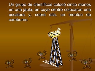 Los científicos colocaron cinco monos en una jaula con una escalera que llevaba a un montón de cambures. Cuando un mono subía, los científicos lo mojaban con agua fría. Luego, los otros monos golpeaban a cualquier mono que intentara subir la escalera. Aunque los científicos reemplazaron a los monos uno por uno, los monos restantes continuaron golpeando a cualquier mono que intentara subir, a pesar de nunca haber recibido el agua fría ellos mismos.