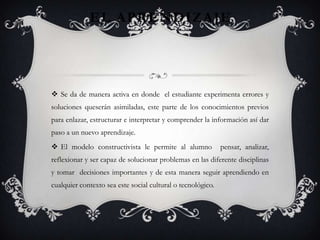 El paradigma constructivista se centra en cómo los estudiantes construyen el conocimiento de manera activa a partir de sus experiencias previas. Los estudiantes aprenden mediante procesos cognitivos complejos como la resolución de problemas. El profesor guía y orienta a los estudiantes pero ellos tienen un papel protagónico en su propio aprendizaje, trabajando de manera autónoma y colaborativa para construir nuevos conocimientos.
